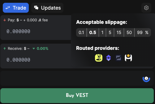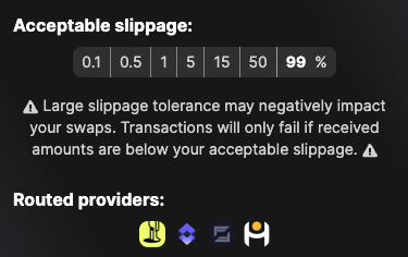 To change your acceptable slippage tolerance, select the slippage percent.  Note: by default the slippage tolerance is set to (.5)  Users can set a minimum of (.1) or a maximum of 99% slippage for their transactions. &#x20;
