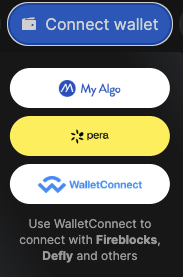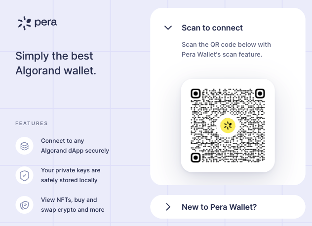 Note: For the Pera Wallet, this will open a QR code that you can scan with your device once connected to the app.